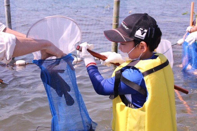 イベント当日は、タモ網を持ってすだて網の中に入り、目の前を泳ぐ魚介類の捕獲体験を行います。体験の際は、大阪湾の幸をふんだんに使った漁師料理を堪能し、捕まえた魚介類は持ち帰ることができます。