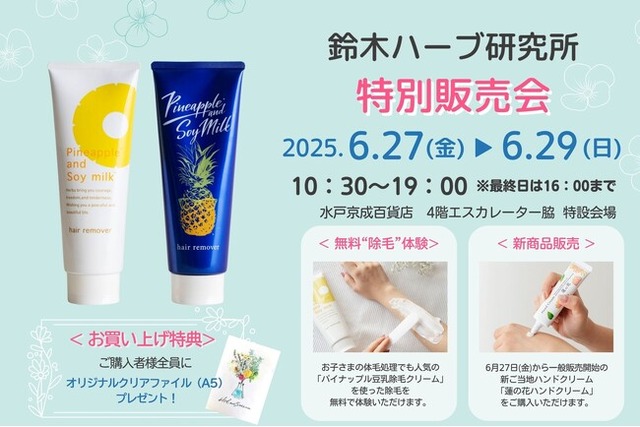 株式会社鈴木ハーブ研究所は6月27日(金)から6月29日(日)までの3日間、水戸市の京成百貨店4階エスカレーター脇特設会場にて特別販売会を実施します。開催時間は10時半~19時(最終日のみ16時)まで。本販売会では、体毛ケア*¹をしながら美肌へ導く《パイナップル豆乳シリーズ》の特別価格販売のほか、同シリーズの「パイナップル豆乳除毛クリーム」を使用した無料の除毛体験や、6月27日(金)より新発売のご当地ハンドクリーム「蓮の花ハンドクリーム」の販売も行います。