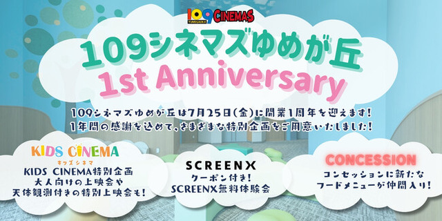 株式会社東急レクリエーション(本社:東京都渋谷区、社長:木村 知郎)が2024年7月に開業した109シネマズゆめが丘(神奈川県横浜市泉区ゆめが丘31番地 ゆめが丘ソラトス13F)は、2025年7月25日(金)に開業1周年を迎えます。1年間の感謝の気持ちを込めて、様々な特別企画を2025年7月4日(金)より実施します。