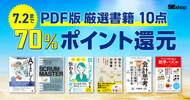 SEshopは、IT書・ビジネス書をはじめ、資格書や実用書まで幅広いラインナップを展開する翔泳社の公式通販サイトです。7月2日(水) まで、厳選したPDF版書籍10点を70%ポイント還元、そのほか対象のPDF版書籍を40%ポイント還元するキャンペーンを開催します。貯まったポイントは1ポイント=1円として次回のお買い物から使えます。