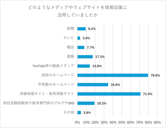 子どもが高校受験を経験した高校1年生~3年生の保護者に対し、高校受験時の情報収集について聞いた。まず、【メディアやウェブサイトからの情報収集】に関して、高校受験経験者の93.1%がメディアやウェブサイトから情報収集を行っており、中学入学後から情報収集を始めた人が84.6%にのぼった。活用しているメディアやウェブサイトは、「高校のホームページ」が79.6%、「受験情報サイト・教育情報サイト」が71.0%だった。メディアやウェブサイトから情報収集を始めた時期については、70.3%が「適切だった」と回答した一方、26.2%が「もう少し早い時期に始めてもよかった」と感じていることが分かった。
