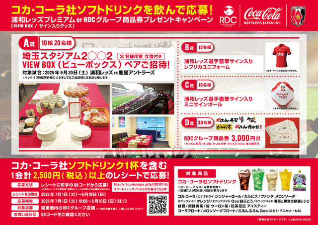 対象期間中、コカ・コーラ社ソフトドリンク1杯を含む1会計2,500円(税込)以上のレシートで応募すると抽選で、浦和レッズプレミアム(VIEW BOX/サイン入りグッズ)orRDCグループ商品券がプレゼントされます。