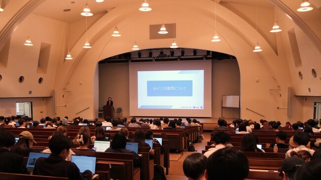 当日は約350名の学生が参加し、当社の事業内容や業界動向について講義を行いました。水インフラを支える仕事内容や就職活動についての説明も行われ、学生たちはその重要性を理解し、興味を持って聴講していました。