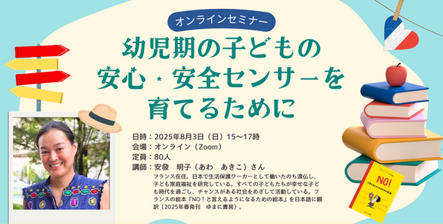 講師プロフィール:フランス在住。日本で生活保護ワーカーとして働いたのち渡仏し、子ども家庭福祉を研究している。すべての子どもたちが幸せな子ども時代を過ごし、チャンスがある社会をめざして活動している。フランスの絵本『NO!と言えるようになるための絵本』を日本語に翻訳(2025年春発刊 ゆまに書房)。HP https://akikoawa.com/