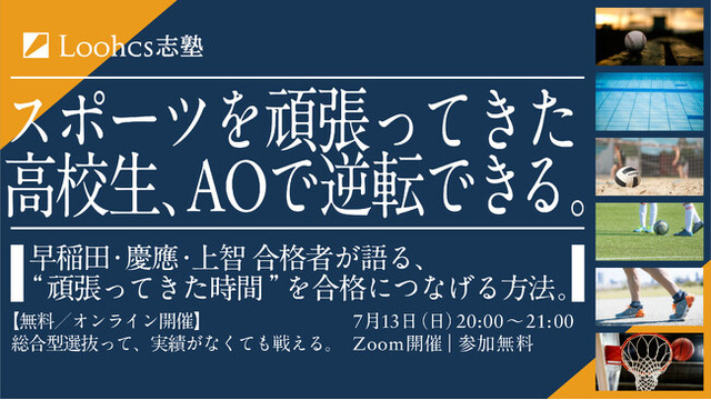 イベント名:スポーツを頑張ってきた高校生のための 総合型選抜 徹底解説講座日時:2025年7月13日(日)20:00~21:00