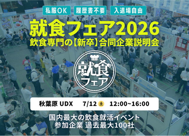 飲食業界専門の新卒就職サイト「エフラボ」が主催する2026年就活生対象の合同企業説明会が7月12日(土)に秋葉原UDXビルにて開催されます。