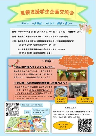 保育教育学科子ども家庭福祉学研究室では、「松江市赤十字乳児院里親家庭サポートセンター てのひら」とともに「里親支援学生企画交流会」を企画しました。交流会のテーマは「多様性・つながり・親子・喜び」です。