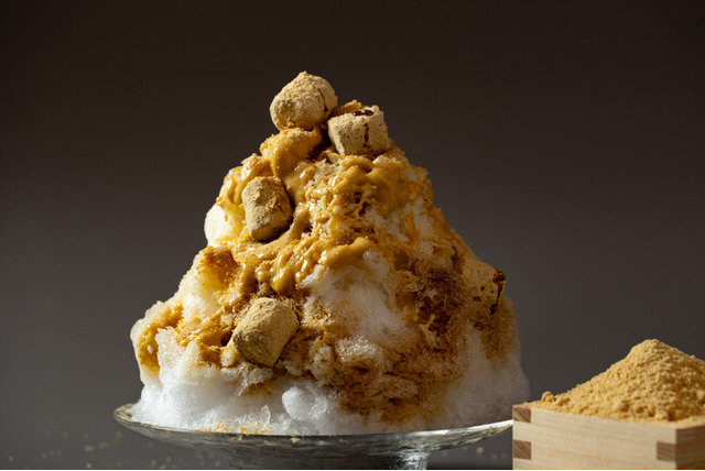 使用している「五家宝」は熊谷市の「熊谷きなこ屋」さんのもの。国産きなこと黒蜜をベースにした和のかき氷の上に、食感が楽しい五家宝をトッピング。さらに、お好みで「追いきなこ」をかけてお召し上がりください。