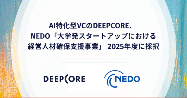 AI特化型ベンチャーキャピタル(VC)である株式会社ディープコア(以下「DEEPCORE」)は、国立研究開発法人新エネルギー・産業技術総合開発機構(NEDO)が実施する「大学発スタートアップにおける経営人材確保支援事業(MPM)」の2025年度実施予定先として採択されました。