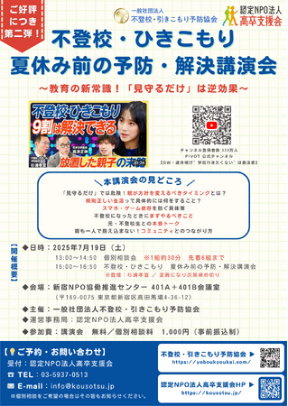 2025年7月19日(土曜日)15時~16時50分 認定NPO法人高卒支援会・一般社団法人不登校引きこもり予防協会は、夏休み中も不登校・引きこもりでお悩みの方を対象にした無料講演会『不登校・ひきこもり夏休み前の予防・解決講演会』を行います。*個別相談のみ有料¥1,000