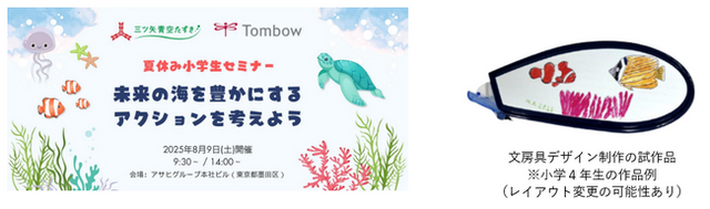 セミナーでは、生活に身近な商品を作る両社の取り組み紹介を皮切りに、「三ツ矢青空たすき」の語り部であり海の環境教育やビーチクリーン活動に取り組む、一般社団法人くらげれんごうの代表 山崎唯(やまさきゆい)氏のお話会、記念品となる豊かな海をイメージした文房具デザイン制作、グループでの意見交換などを行います。“聞いて作って話して”楽しみながら学び、考える時間を提供し、夏休みの自由研究にも適しています。