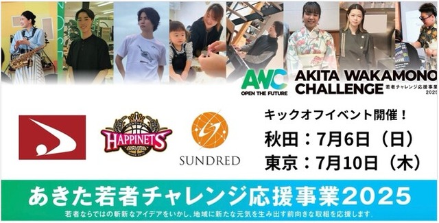 100個の新産業の共創を目指す「新産業のエコシステムビルダー」SUNDRED株式会社(所在地:東京都渋谷区、代表取締役 CEO 兼 GM:留目 真伸、以下:SUNDRED)は、秋田県が若者ならではの斬新なアイデアを活かして地域の活性化に資する戦略的な取組を支援する「あきた若者チャレンジ応援事業 2025」の運営事務局を、昨年度に引き続き、秋田ノーザンハピネッツ株式会社(所在地:秋田県秋田市、代表取締役社長:水野 勇気、以下:秋田ノーザンハピネッツ)との共同企業体「Akita Living Lab」で担当することとなりました。