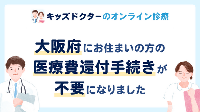 大阪府にお住まいの方にもこれまで還付手続きをお願いしておりましたが、このたび大阪府の医療機関と連携したことで、2025年7月2日(水)18時以降の診察より、還付手続きが不要になりました。キッズドクターのオンライン診療窓口で、医療費助成適用後の金額をお支払いいただきます。オンライン診療のサービス利用料や手数料などは一切いただいていないため、対面病院と同程度のお支払額でご利用いただけます。
