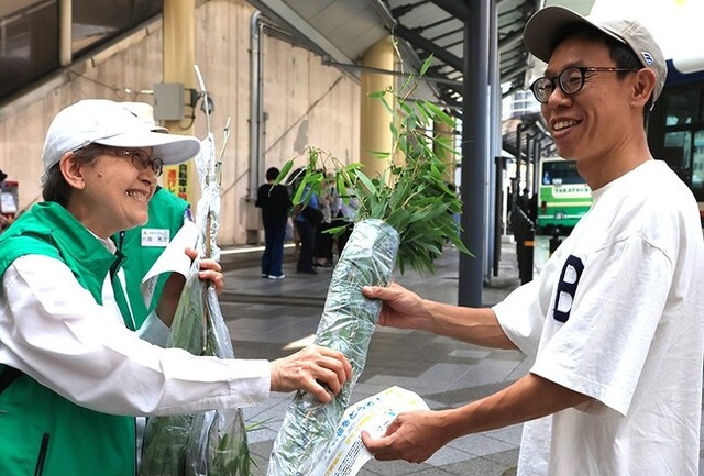 この日、JR高槻駅周辺で市職員、同ネットワーク会員、NEXCO西日本職員の56人がササの配布に参加。駅前を行き交う人たちに「ご自宅に七夕用のササはいかかですか」と声をかけながらササを手渡しました。ササを受け取った人たちは「子どもが喜ぶと思うので、家で一緒に飾り付けします」などと話し、嬉しそうにしていました。