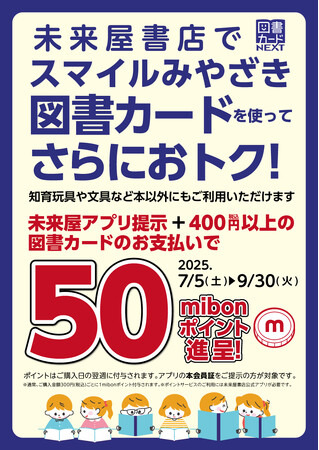株式会社未来屋書店(本社:千葉市美浜区、代表取締役社長:平川雅隆、以下 未来屋書店)は、これまで地域の子どもたちの読書活動を応援してまいりました。この度、宮崎市が子どもの読書推進のために「スマイルみやざき図書カード」の配布をされたことを受け、さらなる読書機会の拡大と学びのサポートに取り組んでいくことをお知らせいたします。