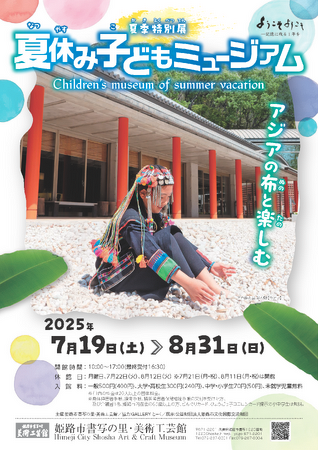 小中学生を対象に工芸品を紹介する展覧会「夏休み子どもミュージアム」。シリーズ第12回目となる今回は「布」をテーマに、「GALLERYとーく」(姫路市)の大橋ひろ美さんがセレクトした、インドやラオス、トルコなどアジアを中心とした古布や衣装をはじめ、糸芭蕉という植物の葉鞘(ようしょう)から作られる沖縄の芭蕉布、葛のツルから作られる静岡県の葛布(くずふ)、シナの樹皮で作られる山形県の科布を総称する日本三大原始布の帯や着物を展示します。