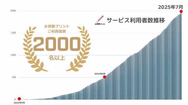 小学校受験対策塾に通う家庭の補助教材として、ペーパー・巧緻性・面接対策を提供する「お受験プリント」は、2025年7月5日時点でサービス利用者数2,000名※¹を突破し、6月の月間アクティブユーザー(GA4)は15,031名を記録しました。初年度のサービス利用者数500名から300%成長を遂げました。