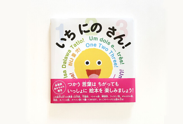 「多言語絵本」とは複数の言語で書かれた絵本のこと。近年、日本に在住する外国人の増加に伴い、多文化共生社会の実現に向けた取り組みの一環として、多言語絵本が注目されています。本作『いち にの さん!』は、日本語、中国語、ベトナム語、韓国語、フィリピノ語、ポルトガル語、英語、ネパール語、スペイン語の合計9言語で書かれた多言語絵本です。