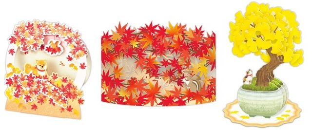 カーブレーザーカード奥行き感のあるカーブ型の機構と、レーザーカットの繊細な表現をかけ合わせた「カーブレーザー」シリーズから紅葉をテーマにしたデザインが登場。美しく色づいた紅葉を何層も重ねています。手前にはさりげなくリスが描かれています。