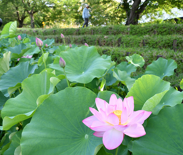 令和7年7月7日(月曜日)、高槻市南庄所町を流れる新川の桜堤付近で、明るいピンク色をした大きなハスの花が今年も開花していて、早朝に散歩する人々を楽しませています。