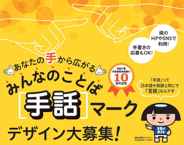県では、手話の普及を通じて、ろう者とろう者以外の者がお互いに、その人格と個性を尊重し合いながら共生することのできる地域社会の実現のために、平成27年4月に「神奈川県手話言語条例」を施行しました。この条例の施行10周年を記念して、ろう者とろう者以外をつなぐ、みんなのことば「手話」を広めるためのマークのデザインを募集します!
