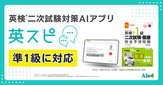 アイード株式会社(本社:東京都新宿区、代表取締役:窪田優希、以下「アイード」)は、英検(R)二次試験対策アプリ「英スピ」において、2025年9月に準1級に対応予定であることをお知らせいたします。既存の3級・準2級・2級と同様に、株式会社旺文社の人気書籍『英検(R)二次試験・面接 完全予想問題 改訂版シリーズ』を収録いたします。