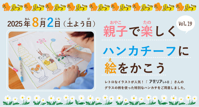 当社が運営するハンカチーフ専門店「CLASSICS the Small Luxury」では、「アデリアレトロ」とのコラボレーションによる限定ハンカチーフを8月下旬より発売予定です。この発売を記念し、今年のワークショップは「アデリアレトロ」と本イベント限定デザインのハンカチーフを用いて、親子で自由にお絵描きを楽しんでいただける内容となっております。