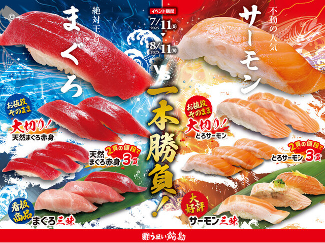 株式会社アミノ(本社:宮城県仙台市、代表取締役執行役員社長:上野 敏史)が運営する寿司業態 「うまい鮨勘」では、2025年7月11日(金)より『まぐろVSサーモン一本勝負!』イベントを開催いたします。