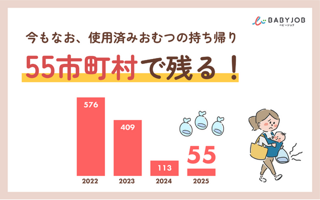 その結果、2022年の調査開始以降、521の市町村でおむつの持ち帰りルールが廃止されたことがわかりました。しかし、厚生労働省が「使用済みおむつは園内で処分することが望ましい」と各市区町村に通達を出してから約2年経ってなお、保護者におむつの持ち帰りを求めている市町村は全国に55(3.9%)残っています。