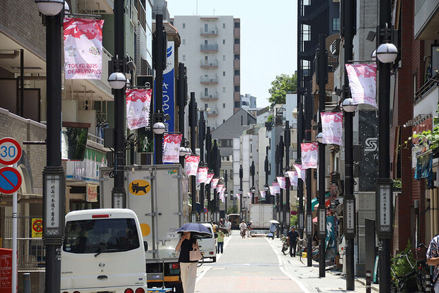 このたび、日本で初開催されるデフリンピックを盛り上げるため区内商店街などの街路灯にフラッグを掲示しました。皆さんでデフリンピックを盛り上げ、選手たちを応援しましょう!!区内シティドレッシングのフラッグ掲示については、順次掲示されます。