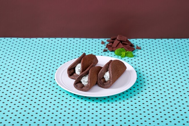 清涼感のあるミントの味わいがしっかりと感じられるふわふわのホイップクリームに、パリッとした食感が楽しめるチョコチップを配合しました。生地はしっとりとして、スイーツ感もたっぷり。ホイップクリームをふわっとはさむオムレット形状のため、一口ほおばるとホイップクリームが口の中で広がり、チョコミントフレーバーをしっかりと楽しめます。