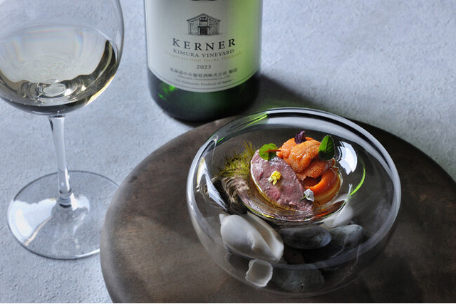 濃厚で甘みの強い雲丹と、低温でじっくりと火入れしペースト状にした夏鹿を組み合わせた冷前菜です。夏の鹿肉はクセが少なく、凝縮された旨みが特徴です。濃厚な雲丹の旨みと、雲丹醤油を隠し味に加えた奥深い味わいの鹿肉が調和し、意外性のある美味しさを堪能できます。また、北海道のワインやナチュラルワイン(*1)を含むワインペアリングと楽しむのもおすすめです。