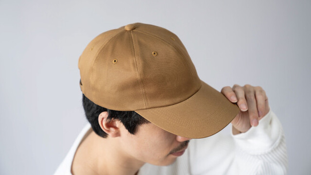 日本国内で織られた高密度のコットン素材を採用。ハリのあるしっかりとした質感で、かぶったときの