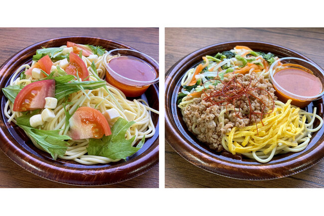(左)アマニ油使用!トマトの冷製パスタ/(右)大豆ミート使用!ビビンバ風冷製パスタ