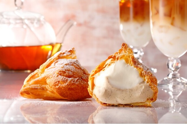大人気のミルクパイから、アールグレイ香る期間限定味「ミルクパイ ロイヤルミルク ティー味」が再登場です!オーブンで焼き上げたサックサクのパイに、紅茶クリームとミ ルククリームの2つのクリームを合わせました。ミルククリームは北海道でつくられた生ク リーム、マスカルポーネチーズ、練乳で仕立てたまろやかな味わいです。紅茶クリームは、 アールグレイ香る華やかな紅茶の味わいをお楽しみいただけます。