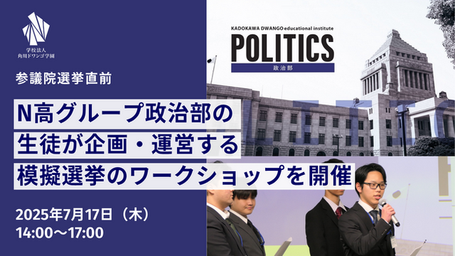 学校法人角川ドワンゴ学園N高等学校・S高等学校・R高等学校(以下、N高グループ)、N中等部は、2025年7月17日(木) 14時より、課外学習プログラム「参院選直前!リアル模擬選挙!ミライ視点で”今”を見つめる『財政・社会保障』」を開催します。