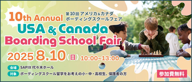株式会社日本入試センター (本社:東京都渋谷区/代表取締役社長:高宮英郎) が運営する海外進学プログラム Y-SAPIX Global Campus (以下、YGC) および留学サポートと教育コンサルテーションを提供する Triple Alpha は、学生団体 Boarding Schools Alumni of Japan (以下、BSAJ)※1の協力を得て、「第10回アメリカ&カナダボーディングスクールフェア」 を8月10日(日)に SAPIX 代々木ホールにて開催します。