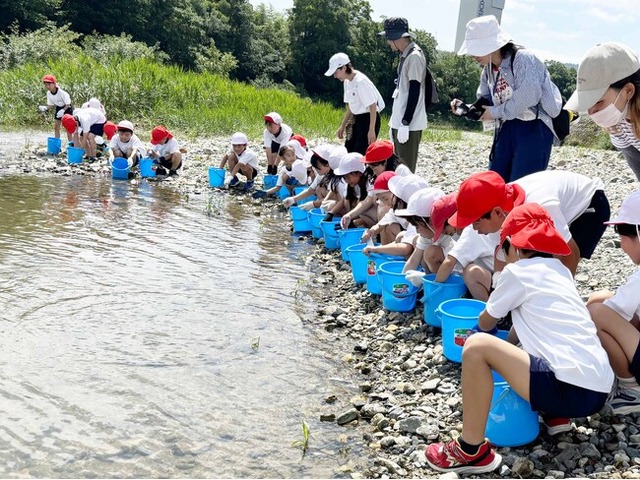 この日、揖保川漁業協同組合(兵庫県たつの市)から届けられた体長8~10cmほどのアユの稚魚、約3,000匹(約30kg)を、子どもたちがバケツに入れて一匹ずつ川へ放ちました。