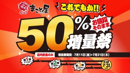 大阪発、牛骨ラーメン専門店「まこと屋」(株式会社マコトフードサービス/本社:大阪市福島区/代表:笠井政志)は、明日2025年7月11日(金)~31日(木)の期間限定で「50%増量祭」を開催いたします。お値段そのままで、生ビールやチャーハン、唐揚げ、ラーメンなどの人気メニューが、なんと最大1.5倍に!