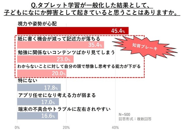 タブレット学習が一般化したことによる弊害として、「紙に書く機会が減って記述力が落ちる」「わからないことに対して自分の頭で想像し、思考する能力が下がる」といった回答が上位5位以内に見られ、タブレットが普及し学びのコンテンツが増えている反面で、思考力や想像力の低下が生じ、知的能力の育成を妨げる子どもの「知育ブレーキ」を多くの保護者が懸念していることがわかりました。(図2)