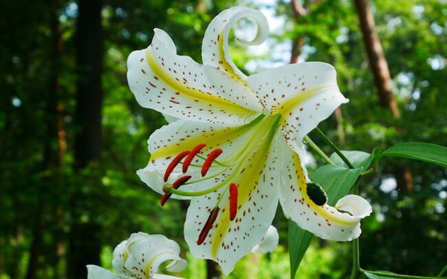 ◆ヤマユリの開花種子から花が開花するまで、約5~7年の歳月を要します。若い株や一度花が咲いても環境が悪くなった株は、養分をため込むため花が咲かない場合があります。そのため、昨年と同じ株が必ずしも咲いているとは限りません。また、まれに通常の花とは異なる斑点のない「白星(しろぼし)」や、花弁の筋が紅色の「紅筋(べにすじ)」と呼ばれる珍しい個体を見ることができます。
