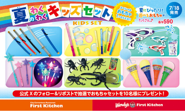 ウェンディーズ・ジャパン株式会社及び、ファーストキッチン株式会社 (所在地:東京都新宿区、代表取締役:紫関修) は、7月18日(金)から、ウェンディーズ・ ファーストキッチンとファーストキッチンの対象店舗で、スペシャルキッズセットを販売します。今夏は、見た目にもわくわくできる“夏にぴったりなおもちゃ”を厳選!夏のわくわくはウェンディーズとファーストキッチンにお任せ!数に限りがありますので、お早めにご来店ください。また、7月11日(金)~7月25日(金)の期間中、ファーストキッチンの公式X(旧Twitter)アカウント(@FK_PR)をフォローし、対象ポストをリポストいただくと抽選で10名様に、スペシャルおもちゃセットをプレゼントいたします。ぜひご参加ください!