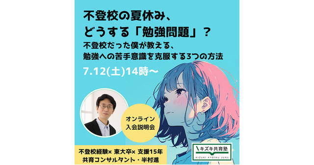 不登校・ひきこもり・中退・通信制高生などの勉強・受験をサポートする完全個別指導塾・キズキ共育塾が、「勉強が苦手」を克服し、この夏を「勉強をやれる夏」にする方法をお伝えするオンライン入会説明会を実施します。