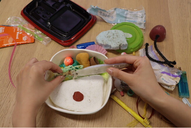 私たちヒトは、多ければ年間でお弁当1個分程度のプラスチックを体内に取り込んでいるということが分かってきました。今回のワークショップは、プラスチックごみを主な素材としたお弁当を制作することで、1年間に摂取するプラスチック量とは、どのくらいの量なのかを、楽しみながら具体的に考えてみようという企画です。