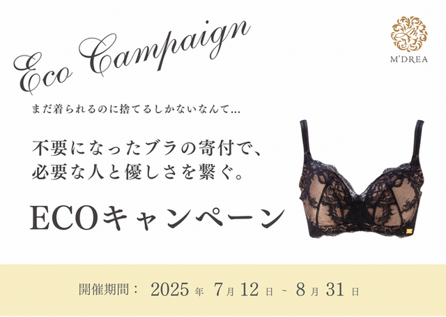 高品質な国産ランジェリーを展開する「M’DREA(マドレア)」は、2025年7月12日より不要になったブラを回収・寄付する「ECOキャンペーン」を再開催いたします。