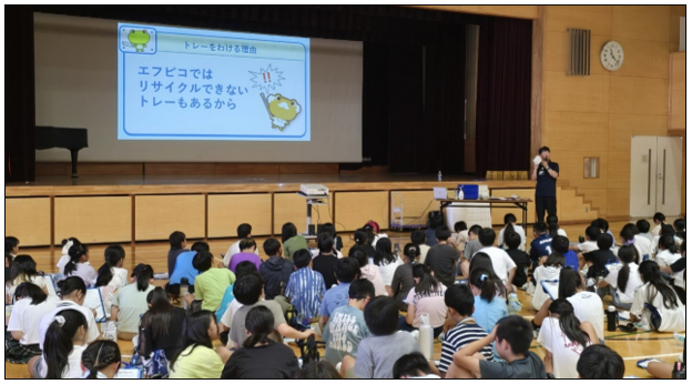 食品容器製造メーカーのエフピコによる『トレーtoトレー』の水平リサイクル(店頭で回収した食品トレーを新たな食品トレーに生まれ変わらせる資源循環の仕組み)について、当社オリジナルのリーフレットを使いながら、まんがで楽しく学べる授業を実施