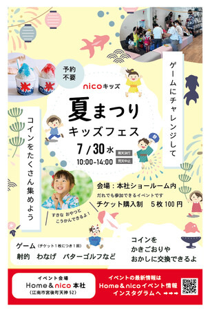 Home&nico(安井建設株式会社、本社:愛知県江南市)は、日ごろお世話になっている地域の皆様への感謝の気持ちを込めて、親子で心ゆくまで楽しめる夏の特別イベント「夏まつりキッズフェス2025」を、2025年7月30日(水)に開催いたします。