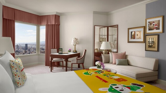 そんな優雅であたたかみ溢れる空間に、大阪の旅へのわくわく感を表現しました。この宿泊プランのためだけに作られたザ・リッツ・カールトン大阪オリジナルのドアマットやベッドスロー、クッションを配置。バスルームの壁面にはミキハウスのキャラクター「プッチー」・「うさこ」と旅をしているような気持ちにさせてくれる大阪の街の地図が出現します。