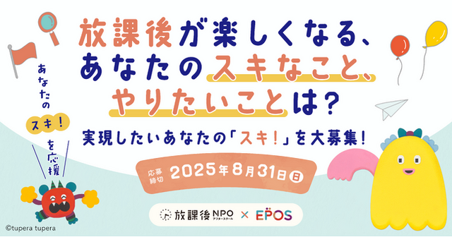 「日本中の放課後を、ゴールデンタイムに。」をミッションに活動する 特定非営利活動法人 放課後NPOアフタースクール(代表理事:平岩国泰、本部:東京都文京区/以下「放課後NPOアフタースクール」)は、2025年7月11日(金)~8月31日(日)までの期間、全国の小学生たちから「放課後が楽しくなるスキなこと、やりたいこと」を募集します。そして、応募アイデアの中から一つを選出し、その実現をサポートします。