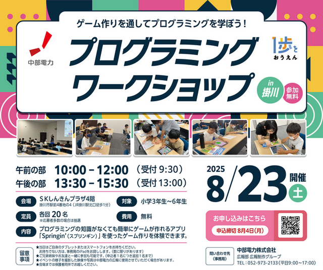 中部電力は、未来を担う子どもたちが勇気を出して踏み出す「1歩」を応援する、「一歩応援プロジェクト」の一環として、静岡県掛川市にてプログラミングワークショップを実施いたします。